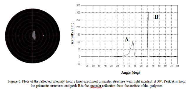 يتمثل الدور الرئيسي للهيكل المنشوري الانعكاس ، كما هو موضح في الشكل 1 ، في إعادة توجيه الضوء من زاوية الانعكاس المرآوي إلى اتجاه أكثر ملاءمة ، ويمكن بسهولة عرض ذلك الحادث الخفيف عند ~ 30° الى الطبيعيسيتم إعادة توجيهنحو الطبيعي إذا 10° يتم استخدام الهياكل المنشورية. تم التحقق من ذلك عن طريق قياس الحساسية الزاوية للانعكاس من العينات المشكّلة بالليزر باستخدام مصدر الضوء الأبيض. ويبين الشكل 6 مؤامرة قطبية ومقطع عرضيمن شدة الضوء المقاسة كدالة للزاوية. كان ضوء الإدخال حادثة بزاوية 30° إلى العادي ويمكن رؤية اثنين من قمم انعكاس. تكون الذروة الأوسع على اليسار (ذروة & quot؛ A & quot؛) من 10° microprisms إعادةتوجيه الضوء نحو الوضع الطبيعي في حين أن الذروة الضيقة على الجانب الأيمن (الذروة & quot؛ B & quot؛) تنتج عن الانعكاس المرآوي من السطح الأمامي للبولي كربونات.