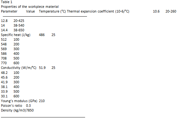 تُعتبر أداة تصلب الزيت الصلب O1 في هذه الدراسة. يمكن تمثيل ضغوط Von Mises المكافئة لهذه المادة ، σ ، من خلال نموذج Johnson-Cook على أنه [15]SES. بالنسبة لتأثير ارتداء الحفرة ، تم الإبلاغ عن عدد قليل جدًا من الدراسات ، على الرغم من أن ميكانيكي تشكيل هذاISM مهم بنفس القدر. Komvopoulos و Erpenbeck [13]التحقيق في التأثيرات المشتركة لارتداء الحفرة وحافة المبنى (BUE) باستخدام نموذج FE وافتراض متساوي الحرارةنشوئها. لفهم بشكل أفضل تأثيرات هندسة الأدوات التي تسببها ارتداء الحفرة على معلمات القطع ، يجب تطبيق نموذج ميكانيكي حراري بالنظريرتبط بقوة مع ارتفاع درجة الحرارة أثناء عملية الآلات.